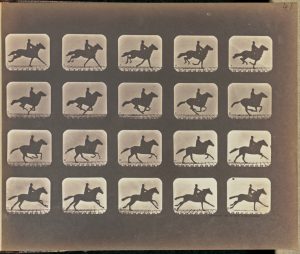 We will start by looking at of one of the many photographic firsts attributed to Talbot: the first successful photograph of a rapidly moving object, frozen long in the position it held for only a single instant. We are all familiar with late-nineteenth-century photographs by Etienne-Jules Marey and Eadweard Muybridge. Such images became iconic representations of photography’s power to go beyond the limitations of the eye to bring into view individual instants that were otherwise unperceivable. Talbot’s first “instantaneous” photograph of rapid movement, taken decades before these in 1851, was of a very different subject. He attached a piece of paper with text printed on it to a whirling mechanism that spun it around so quickly that it was only visible as a dull, grey blur. He then took a photograph of this spinning disk in a dark room, illuminated by the flash of a single electric spark. He found the printed letters in the resulting photograph to be “just as sharp as if [they] had been motionless.”